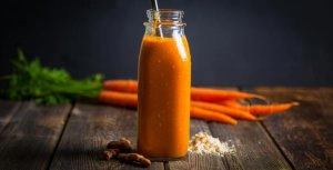 Giet het wortelsap over in een glazen pot. Hierna kan het enkele dagen worden bewaard, maar het is het lekkerst als het vers is. Voeg de smoothie-ingrediënten toe aan de blender of keukenmachine en mix op hoge stand tot het romig en glad is. Voeg meer wortelsap of amandelmelk toe als het moeilijk is om te mengen. Schraap indien nodig langs de zijkanten.